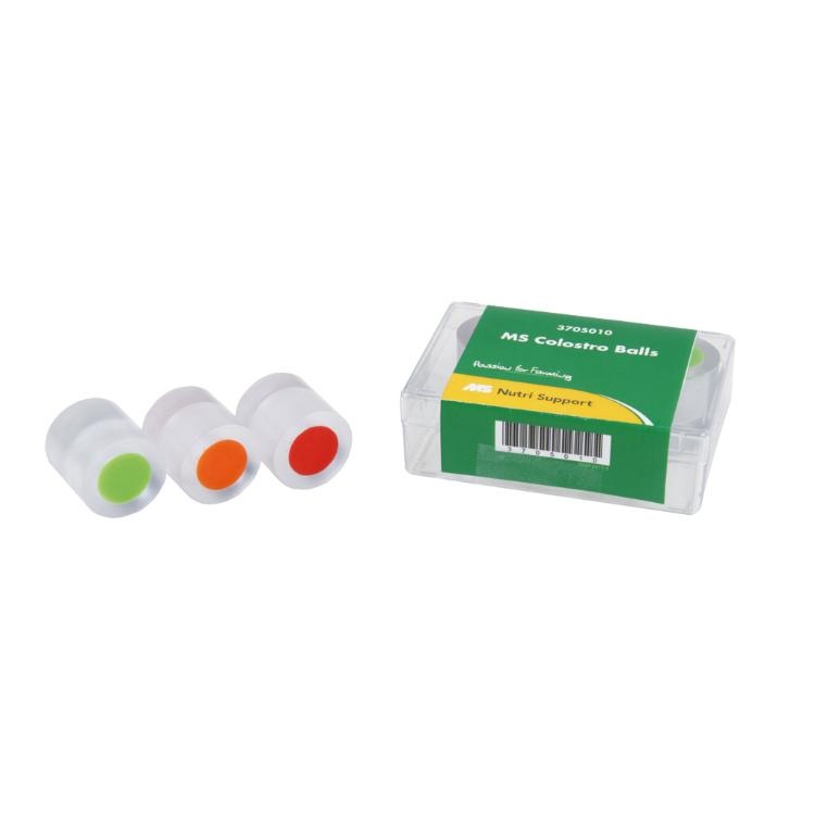 Geben Sie die MS Colostro Balls in die Biestmilch und schauen Sie, wie viele MS Colostro-Balls oben schwimmen. Set aus 6 Bällen (2 rote, 1 orangen, 3 grüne), für die Überprüfung der Qualität des Kolostrums. Die Qualität des Kolostrums wird durch die Anzahl von Bällen, die nach oben steigt angezeigt.